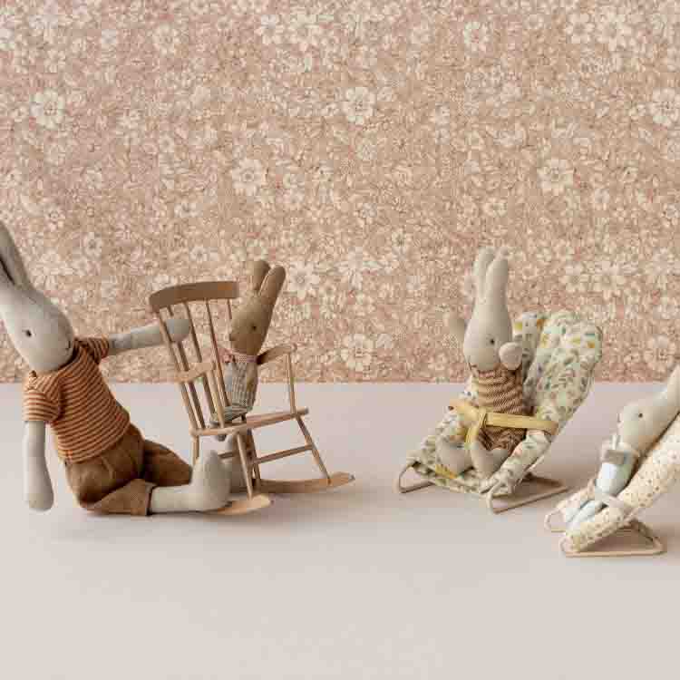 With this babysitter, it is easy to put your little friends to sleep. The base is made of metal and covered with the most beautiful fabric. The chair fits perfectly with rabbits in size "My" and baby mice