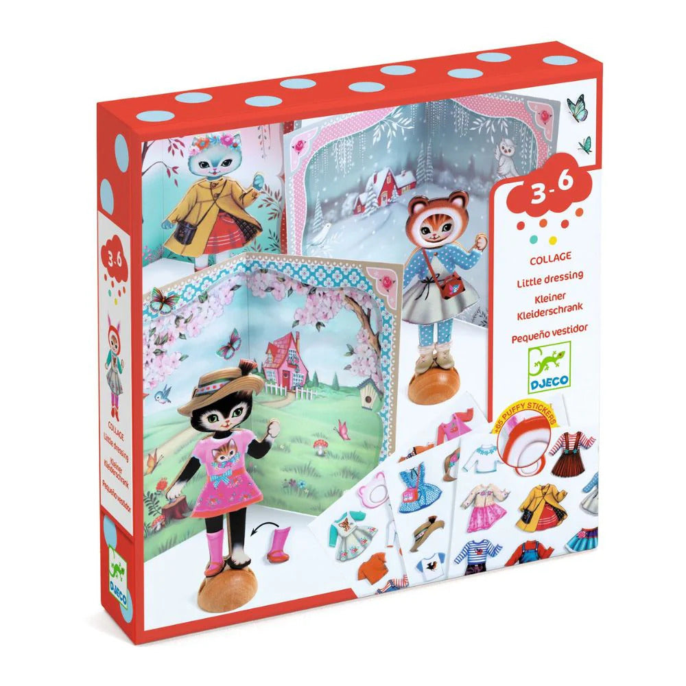 A collage activity: dress up the 3 adorable wooden cats with more than 45 items of clothing that can be stuck and restuck however you like!