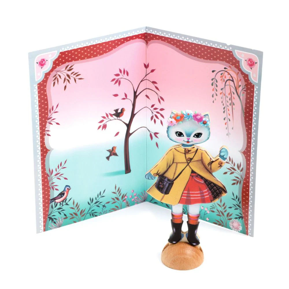 - Contents: 3 wooden cats with stand, + 45 sturdy reusable items of clothing (3 sheets), 3 cardboard scenes and 1 step-by-step instruction booklet.