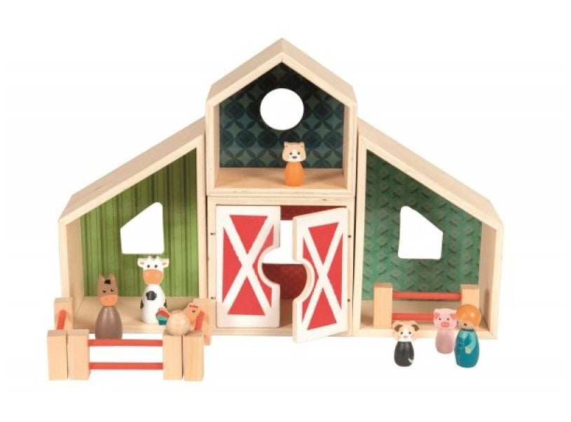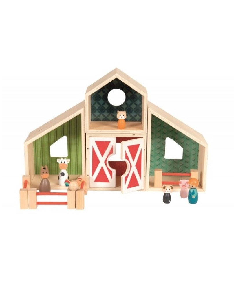 An assortment of well-made and chunky wooden constructions for little hands and big imaginations. The farm is compatible with our doll house, train and tractor.
