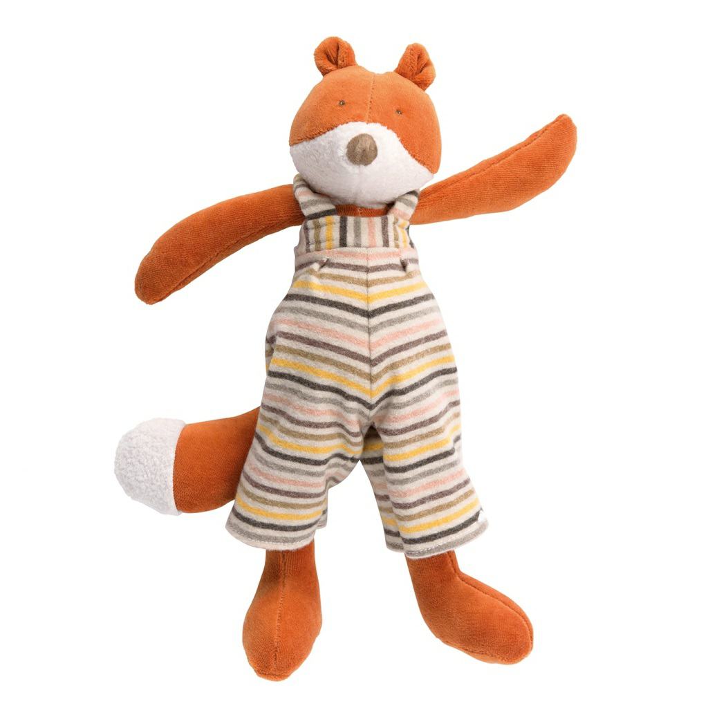 Introducing the Moulin Roty Tiny Gaspard the Fox, made in soft chestnut and cream velour and dressed in striped flannelette dungarees in brown, peach, grey and yellow which is removable for washing, his facial features are embroidered, providing added safety!